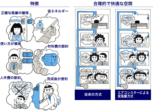 エアコンスターは、室内へ冷温風を正確に分配する可変定風量装置として開発された、画期的な空調機器です。